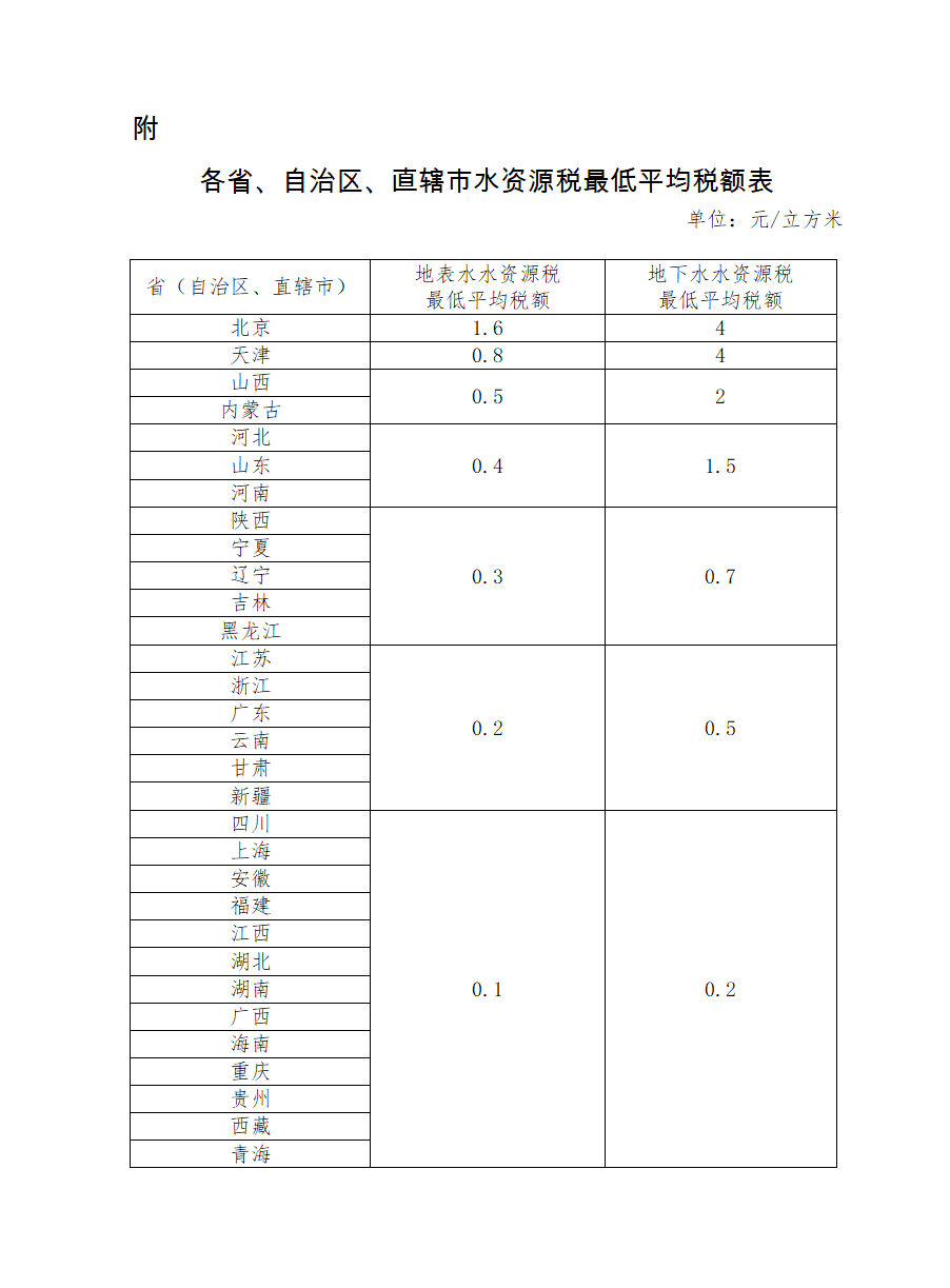 财政部、税务总局、水利部联合印发 《水资源税改革试点实施办法》,自2024年12月1日起全面实施水资源费改税试点。水资源税的纳税人为直接从江河、湖泊(含水库、引调水工程等水资源配置工程)和地下取用水资源的单位和个人。水资源税实行从量计征。水资源税根据水资源状况、取用水类型和经济发展等情况实行差别税额。国家统一明确各省、自治区、直辖市水资源税最低平均税额标准,具体适用税额由各省、自治区、直辖市确定。同时,要求对取用地下水、水资源严重短缺和超载地区取用水从高确定税额。对规定限额内的农业生产取用水等五种情形,免征水资源税;对超出规定限额的农业生产取用水以及农村集中饮水工程取用水,授权地方减免水资源税;对用水效率达到国家用水定额先进值的相关纳税人,减征水资源税。全面实施水资源费改税试点后,水资源税收入全部归属地方(原水资源费收入实行中央和地方1:9分成),适当增加地方自主财力。