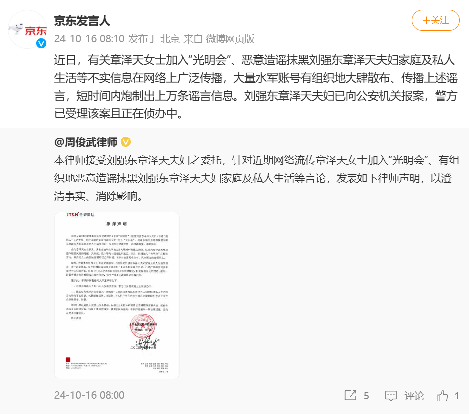 据红星新闻,10月16日,“京东发言人”发布声明称,近日,有关章泽天女士加入“光明会”、恶意造谣抹黑刘强东章泽天夫妇家庭及私人生活等不实信息在网络上广泛传播,大量水军账号有组织地大肆散布、传播上述谣言,短时间内炮制出上万条谣言信息。刘强东章泽天夫妇已向公安机关报案,警方已受理该案且正在侦办中。