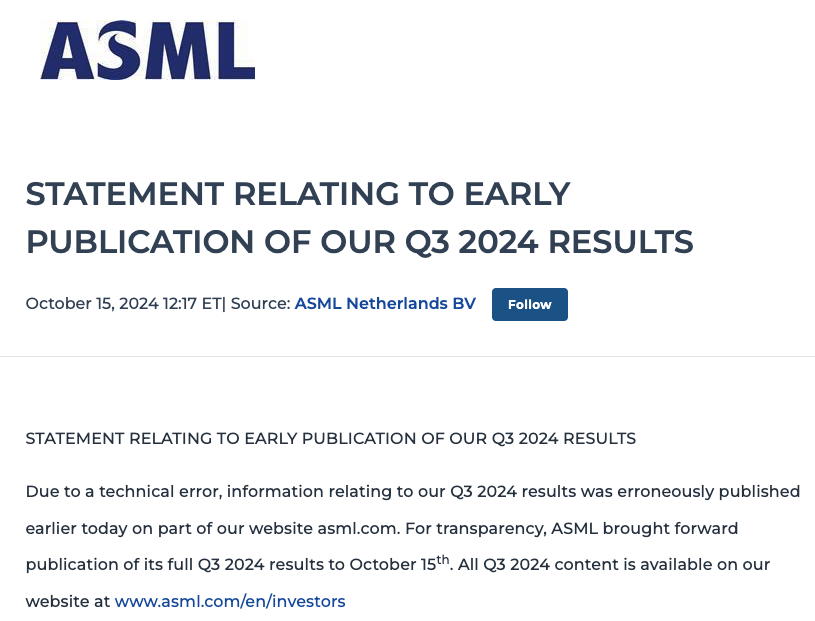 就在发稿前,阿斯麦发布官方声明,宣布是因为“技术故障”导致错误地提前发布财报。