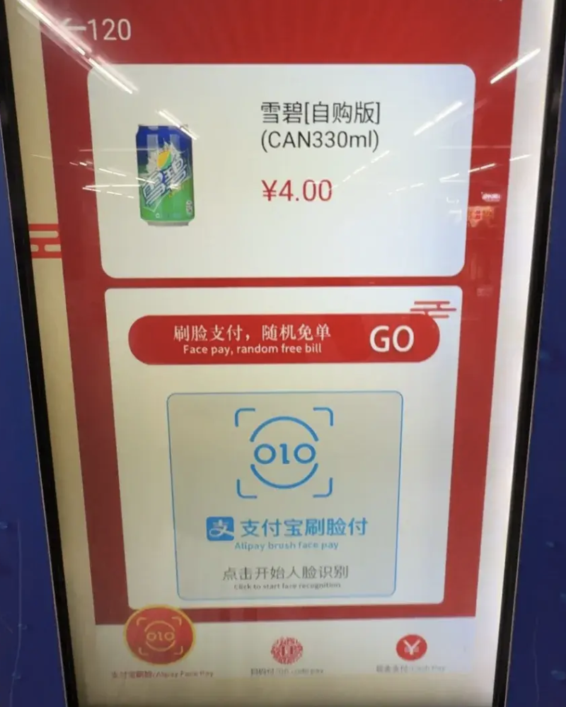 记者走访地铁徐家汇站,该站因空间较大,拥有数量较多的自动售货机。其中一台“AI智能识别柜”的屏幕上,“人脸支付”的字样被放在支付选项的上方,框线颜色作加深处理,“扫码支付”则放在下方。