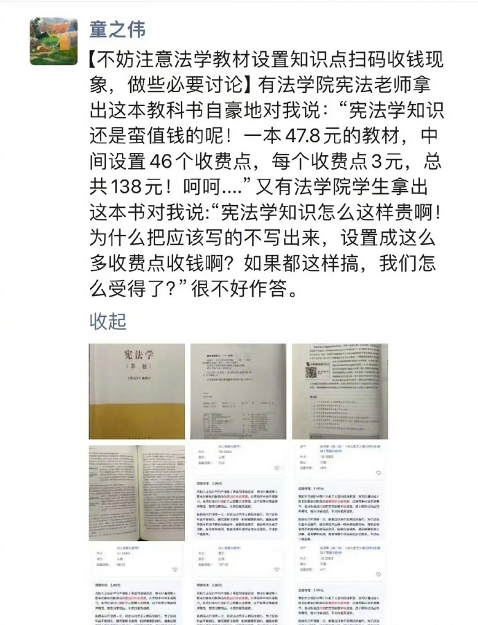 据中国新闻周刊,近日,华东政法大学教授童之伟在朋友圈提出,应关注法学教材设置知识点扫码收费现象。其指出,高等教育出版社《宪法学》教材中设置了46个二维码收费点,每个3元共138元,扫码付钱才能解锁新知识。