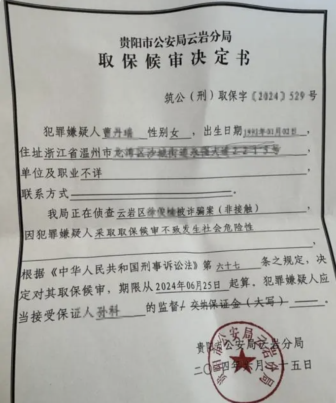 温州市公安局龙湾分局中心派出所内,在说明自己的遭遇后,曹女士却被告知,自己已被贵阳市公安局云岩分局列为网逃人员挂在网上,“说是云岩那边有受害者报案被诈骗200万,其中有一笔资金14万是打到了我的卡里,所以这笔就是涉案资金。”