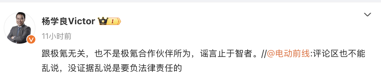 针对网传涉及Mobileye和极氪汽车的言论,10月16日晚间,吉利控股集团高级副总裁杨学良在微博回应,称此事“跟极氪无关,也不是极氪合作伙伴所为,谣言止于智者”。