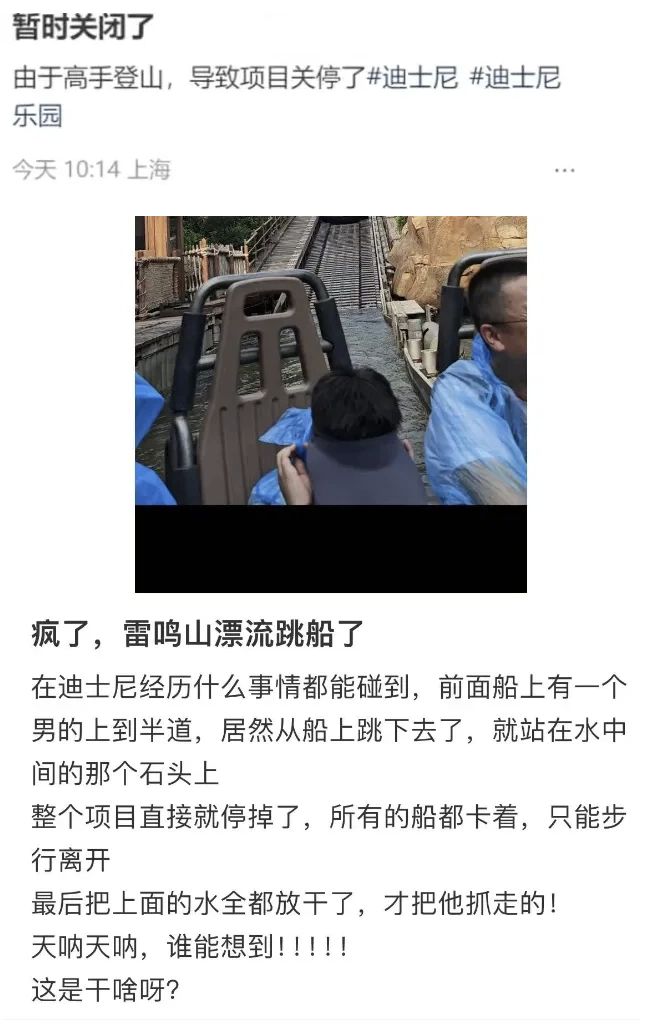 事发上海迪士尼雷鸣山漂流,有人“跳船后登山”?官方回应。