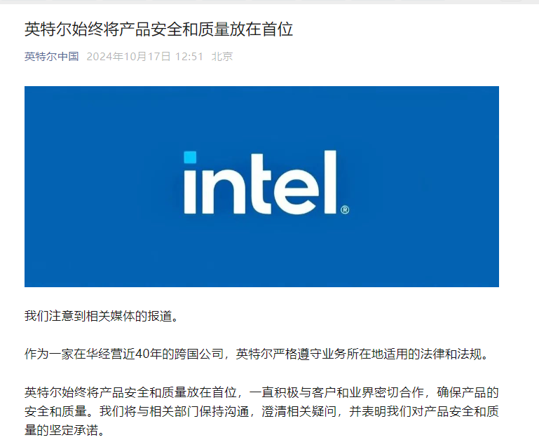 据界面新闻,英特尔中国10月17日在官微回应此前中国网络空间安全协会点名批评:作为一家在华经营近40年的跨国公司,英特尔严格遵守业务所在地适用的法律和法规。 英特尔始终将产品安全和质量放在首位,一直积极与客户和业界密切合作,确保产品的安全和质量。我们将与相关部门保持沟通,澄清相关疑问,并表明我们对产品安全和质量的坚定承诺。