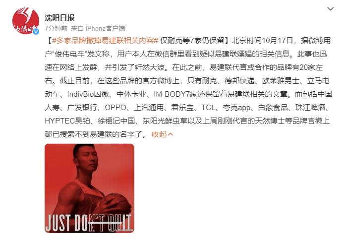 截止目前,在这些品牌的官方微博上,只有耐克、德邦快递、欧莱雅男士、立马电动车、IndivBio因微、中体卡业、IM-BODY7家还保留着易建联相关的文章。而包括中国人寿、广发银行、OPPO、上汽通用、君乐宝、TCL、夸克app、白象食品、珠江啤酒、HYPTEC昊铂、徐福记中国、东阳光鲜虫草以及上周刚刚代言的天然博士等品牌官微上都已搜索不到易建联的名字了。
