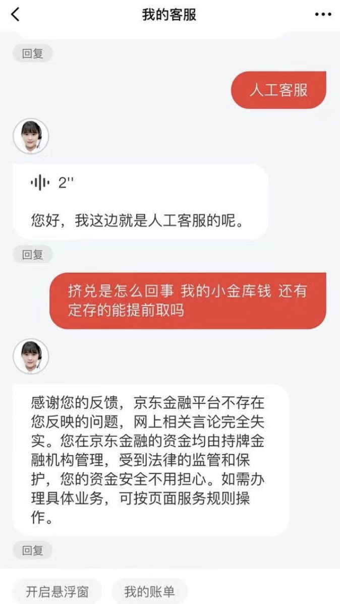 10月18日上午,记者联系到京东金融人工客服,询问京东金融挤兑传言,对方表示:“京东金融平台不存在您反映的问题,网上相关言论失实,用户在京东金融的资金均由持牌金融机构管理,受到法律的监管和保护,无需担心资金安全。”