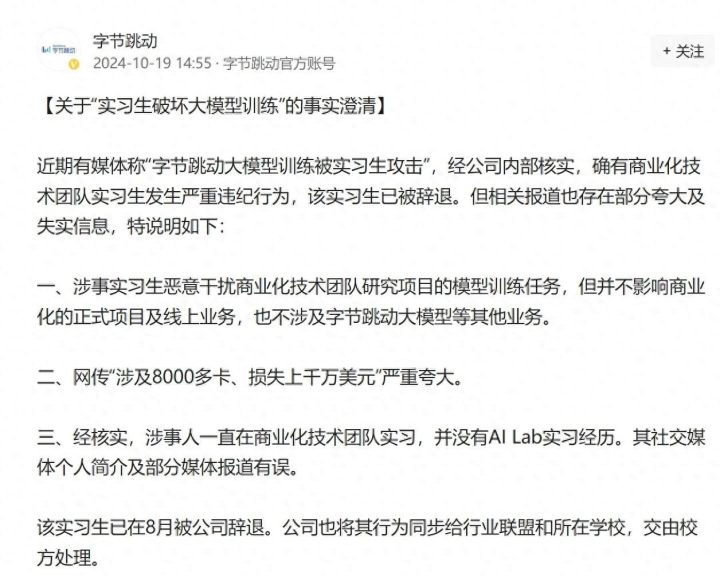 字节跳动回应“大模型训练被实习生攻击”传闻。