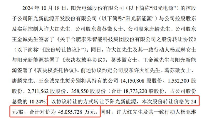 根据协议,许大红等4人将其合计持有的1877.32万股股份转让给阳光新能源,占公司总股本的10.24%。