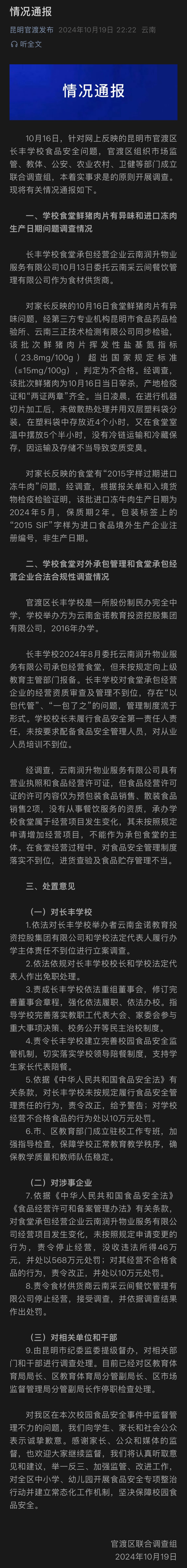 对家长反映的10月16日食堂鲜猪肉片有异味问题,经调查,该批次鲜猪肉为10月16日当日宰杀,产地检疫证和“两证两章”齐全。当日凌晨,在进行机器切片加工后,未做散热处理并用双层塑料袋分装,在塑料袋中存放近4个小时,又在食堂室温中摆放5个半小时,没有冷链运输和冷藏保存,因运输及存储不当导致变质变臭。