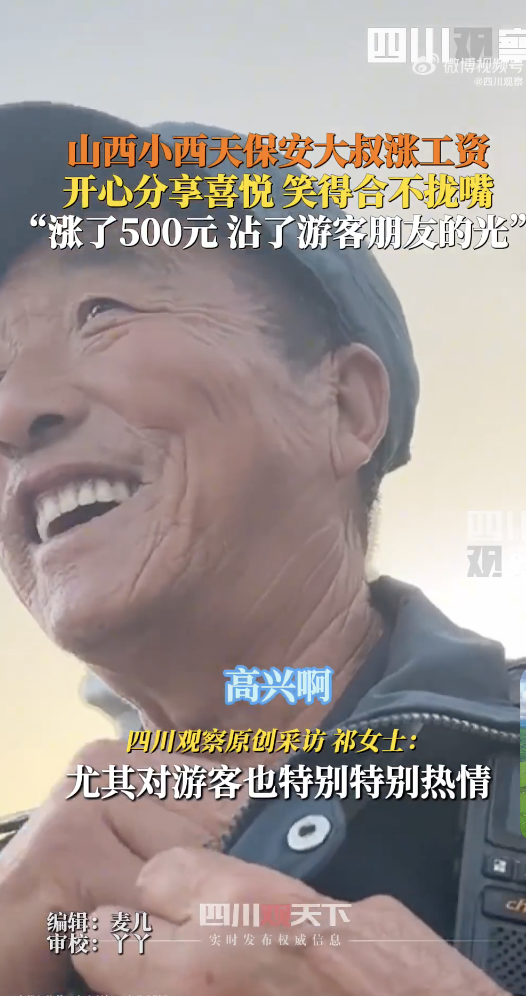 据大风新闻:“咱们游客来了我很感动,要没有这么多的游客,也不可能给我们涨工资,我就沾了咱们游客的光。”山西一女博主拍下保安大叔质朴的话语发到网上。