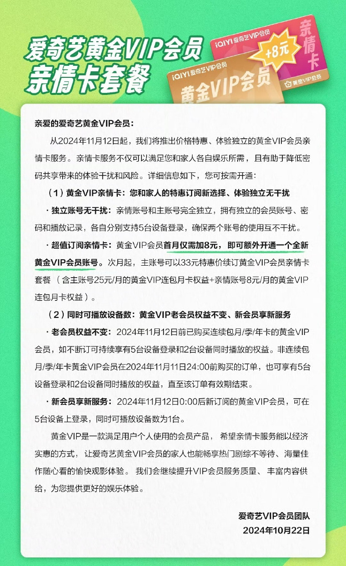 爱奇艺推出亲情卡服务,同时新规限制2024年11月12日0:00后新订阅的黄金VIP会员,可在5台设备上登录,同时可播放设备数为1台。