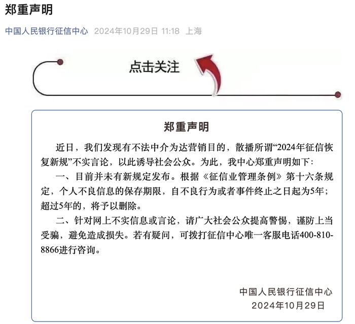 10月29日,中国人民银行征信中心发布声明:近日,我们发现有不法中介为达营销目的,散播所谓“2024年征信恢复新规”不实言论,以此诱导社会公众。为此,我中心郑重声明如下: