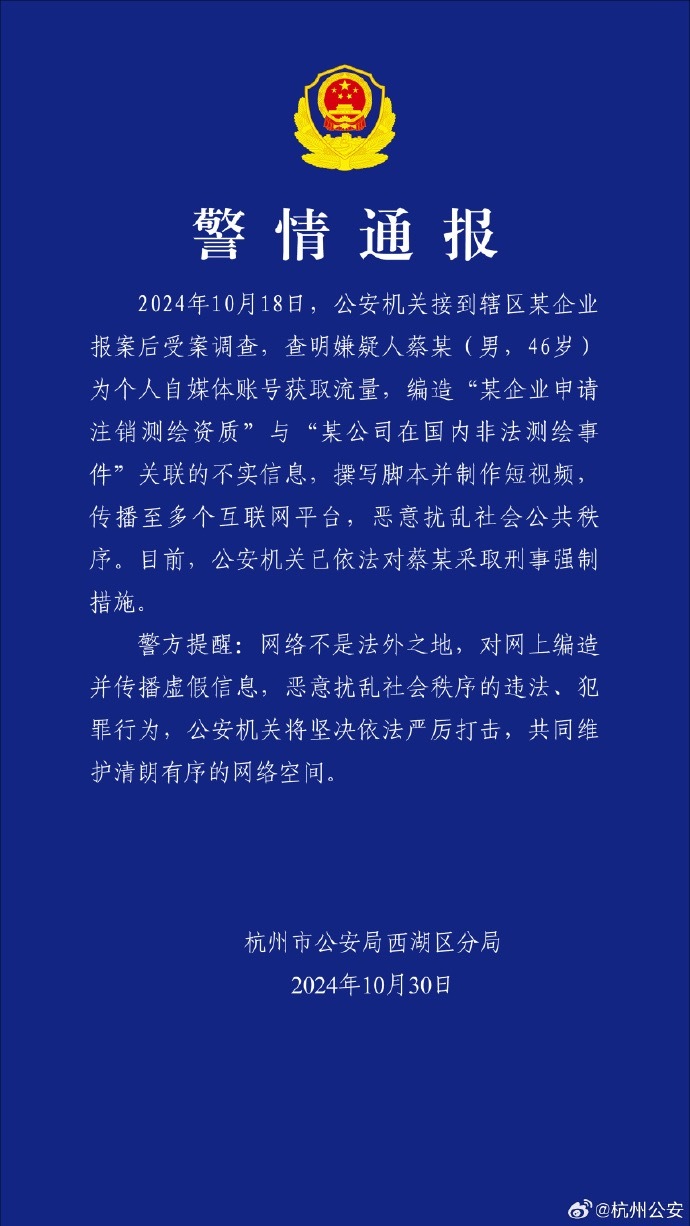 据第一财经,10月30日,杭州市公安局西湖区分局发布警情通报,通报称2024年10月18日,公安机关接到辖区某企业报案后受案调查,查明嫌疑人蔡某(男,46岁)为个人自媒体账号获取流量,编造“某企业申请注销测绘资质”与“某公司在国内非法测绘事件”关联的不实信息,撰写脚本并制作短视频,传播至多个互联网平台,恶意扰乱社会公共秩序。目前,公安机关已依法对蔡某采取刑事强制措施。
