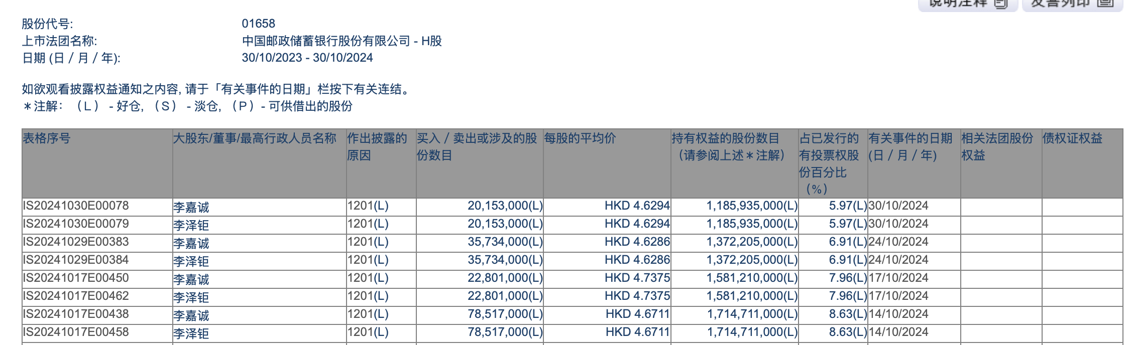 据财联社,根据香港联交所最新权益披露显示,邮储银行H股10月30日再遭李嘉诚、李泽钜父子以每股均价4.6294港元减持约2015.3万股股份,涉及资金约9329.63万港元。本次减持后,李嘉诚及李泽钜持有邮储银行H股约11.86亿股,持股比例降至5.97%。