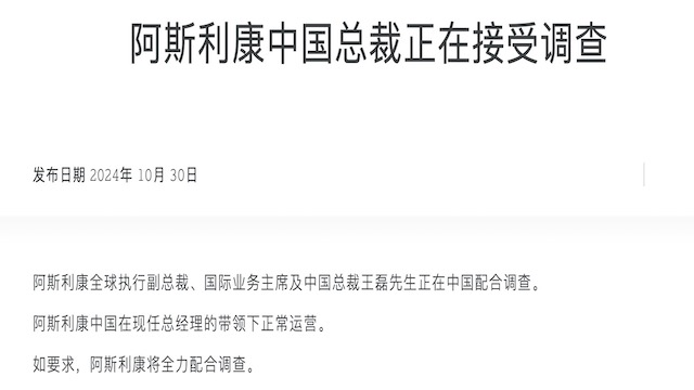 10月30日晚间,阿斯利康中国官网宣布消息称,阿斯利康全球执行副总裁、国际业务主席及中国总裁王磊正在中国配合调查。