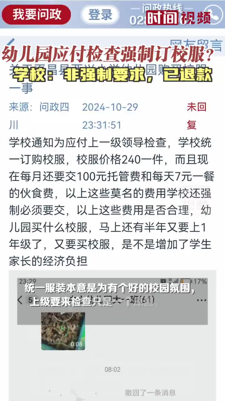 10月29日,网曝四川巴中平昌县西兴小学幼儿园为应付上级检查,强制统一订购240元一套的校服。31日,西兴小学称,没有强制要求购买。统一服装本意是为有个好的校园氛围,上级要来检查只是一个原因,订校服大部分家长都同意,现在已开始退款。 (via 时间视频)
