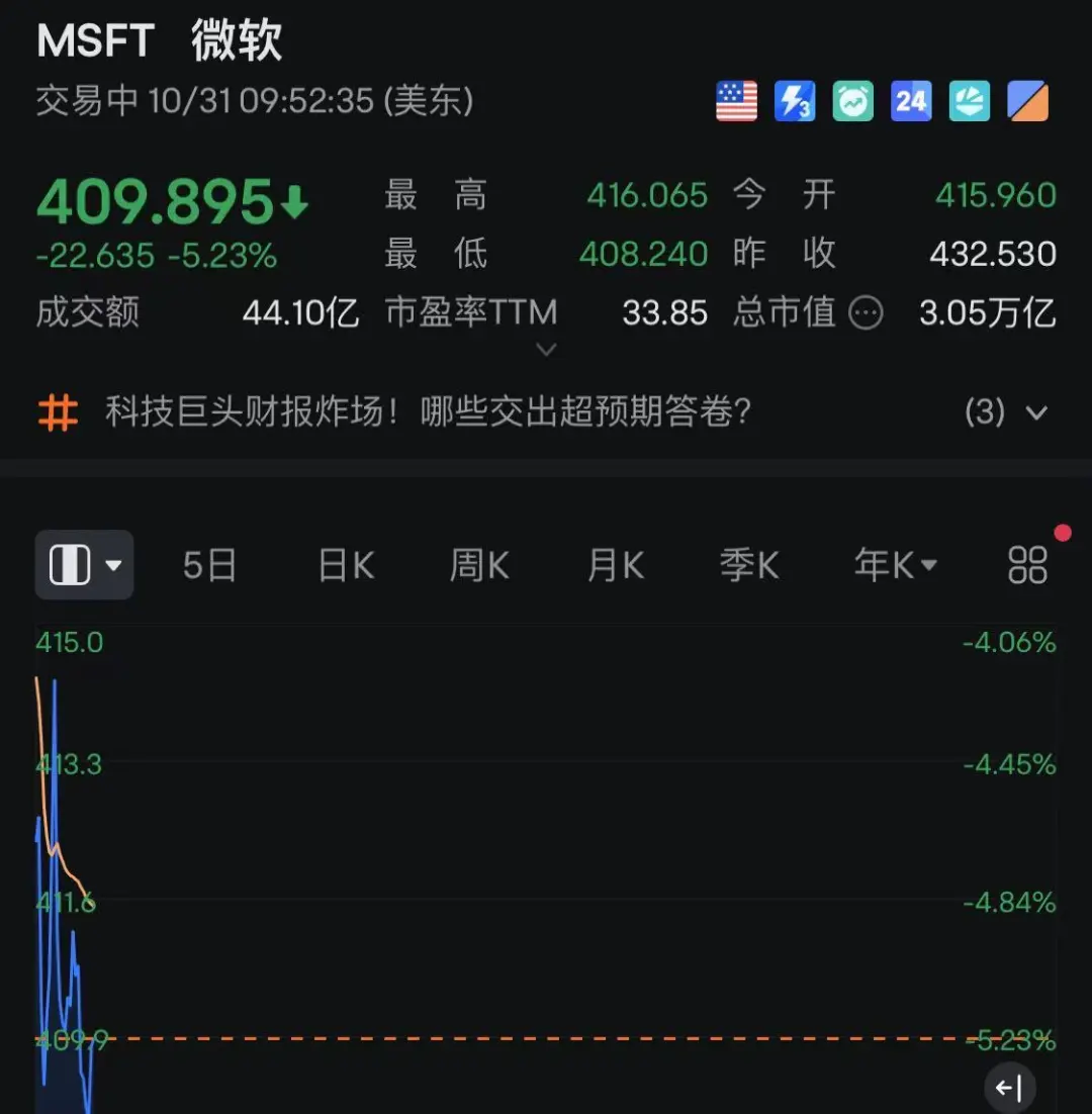 据证券时报e公司,首先是业绩杀,今晚,带崩美股的主要是AI板块,个股方面,美股AI板块集体下跌,超微电脑继昨日大跌后今日继续下跌,微软跌幅超5%,英伟达也跌超2%。