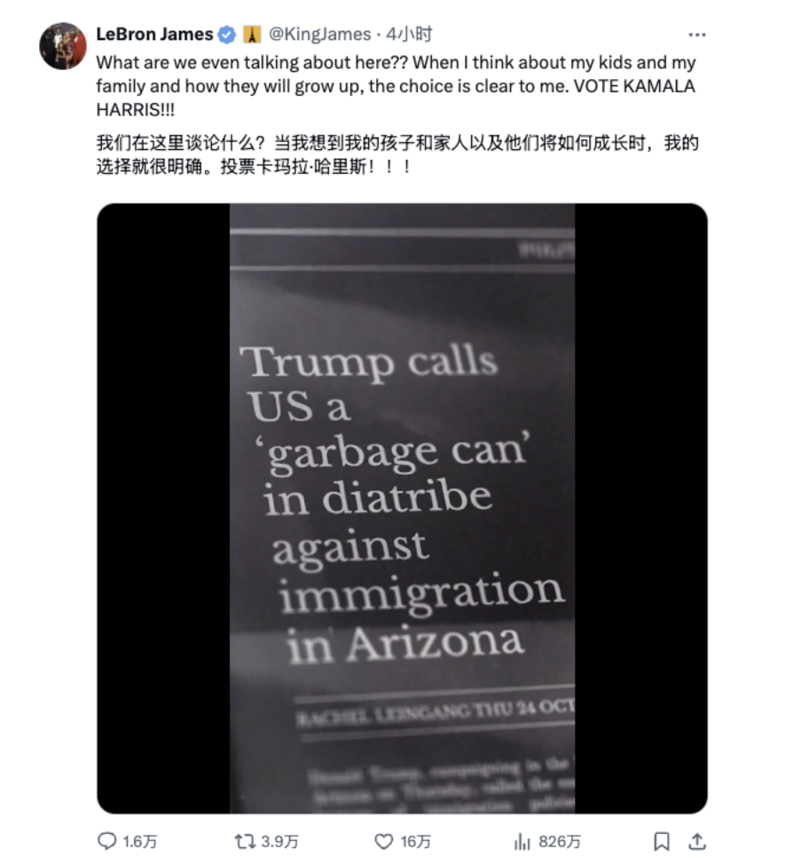 勒布朗·詹姆斯表态将投票支持哈里斯。