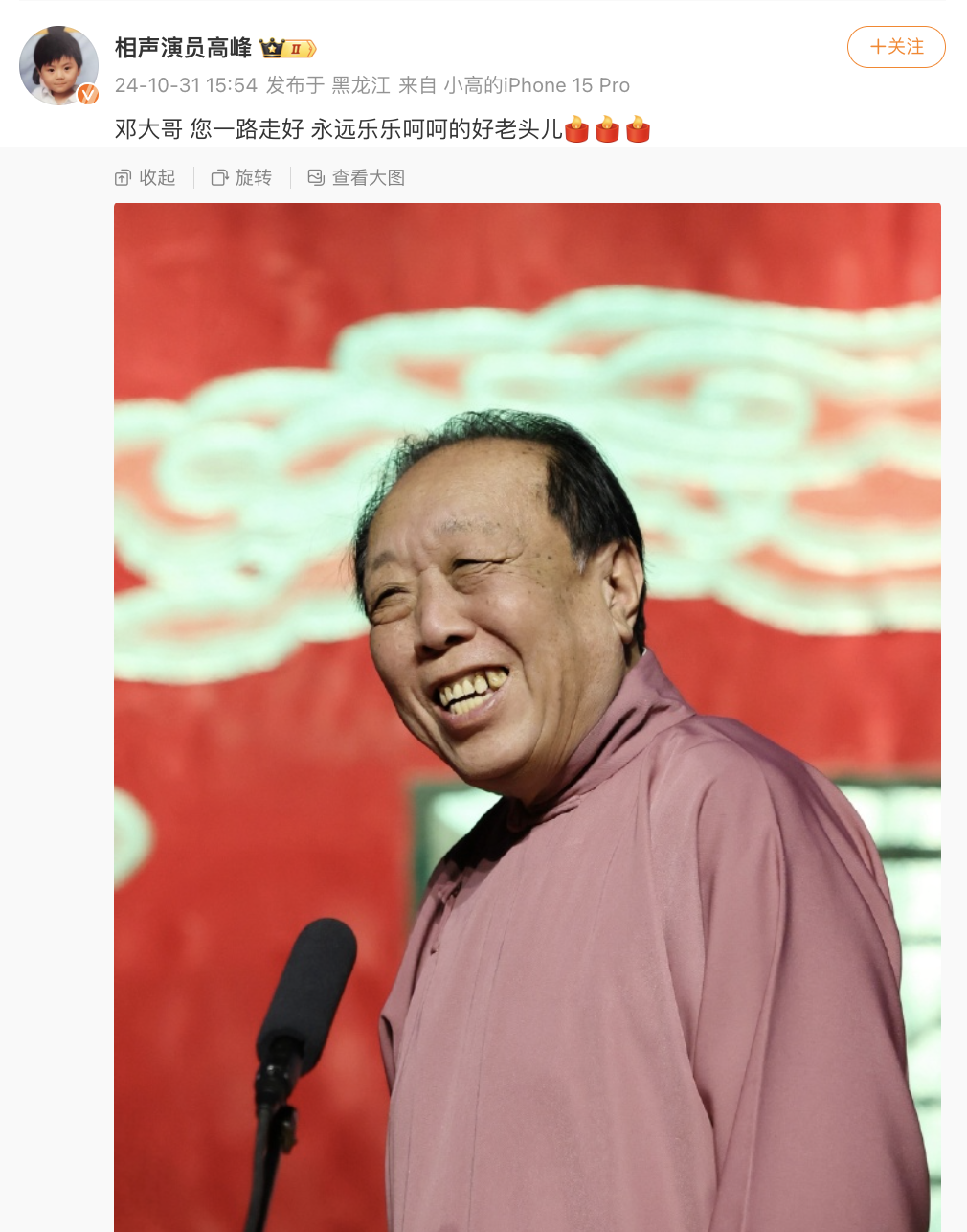 据九派新闻综合,10月31日,德云社相声演员高峰发文悼念邓德勇:“邓大哥,您一路走好!永远乐乐呵呵的好老头儿。”