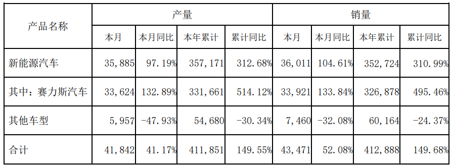 赛力斯:10月新能源汽车销量36011辆,同比增长104.61%。据界面新闻,10月新能源汽车销量36011辆,同比增长104.61%。1-10月新能源汽车销量352724 辆,同比增长310.99%。