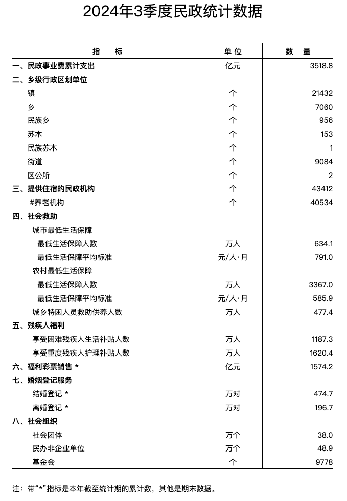 民政部11月1日于官网发布《2024年3季度民政统计数据》。统计数据显示,今年前三季度,全国结婚登记474.7万对,离婚登记196.7万对。较去年同期,今年前三季度结婚登记量减少94.3万对,离婚登记量减少0.6万对。