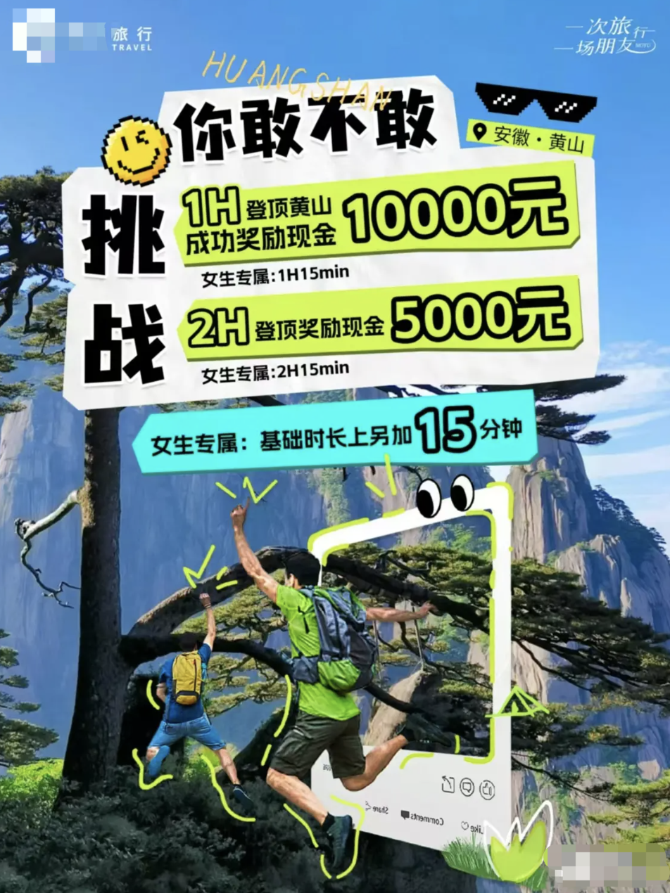 近日,一旅游博主在社交平台发布了一段视频,视频内容是介绍黄山徒步登顶挑战赛,1小时内登顶奖励10000元、2小时内登顶奖励5000元,女生时间再加15分钟,线路是慈光阁到光明顶。视频发布后引发网友热议,转发超10万次。有网友跃跃欲试。