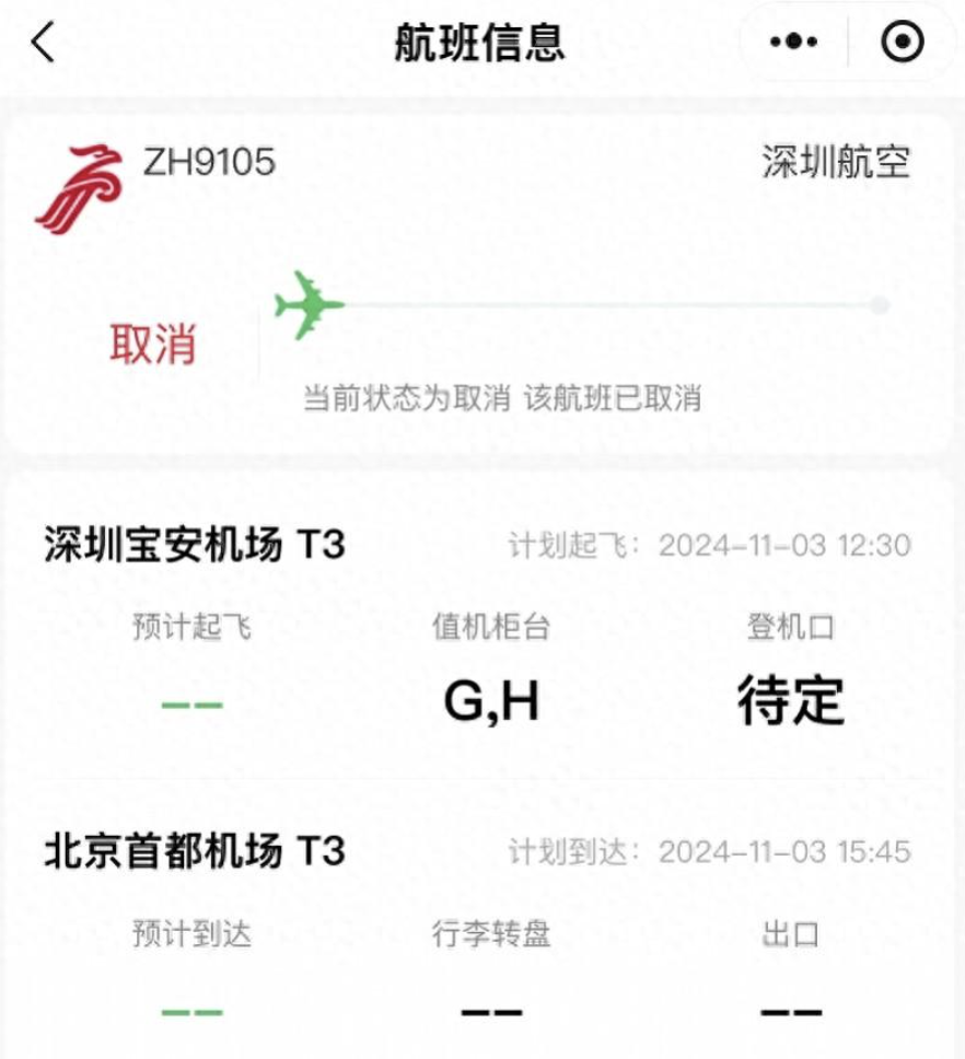 航旅纵横信息显示,11月2日从深圳飞往北京的ZH9105航班实际到达时间为19点33分,比原定到达时间15点45分延误了3小时48分。南都记者查询发现,11月3日从深圳飞往北京的ZH9105航班状态显示为取消。