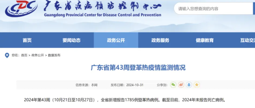 据广东省疾病预防控制中心消息,10月21日至10月27日,广东全省新增报告1785例登革热病例。
