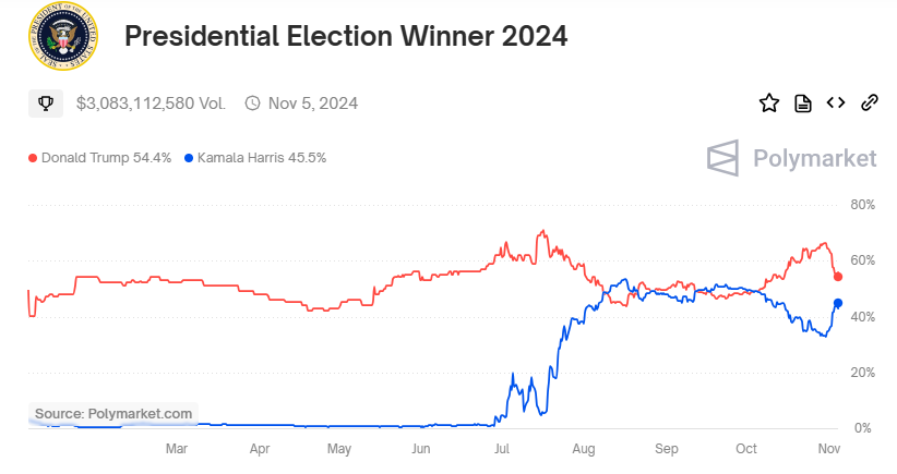 据财联社,根据时下最受瞩目的大选预测平台Polymarket的数据显示,特朗普赢得今年大选的概率最新已降至了54.5%,哈里斯的胜选概率则迅速回升至了45.5%。要知道,就在上周五,即便特朗普的胜率当时已有所回落,但依然高达63.2%。