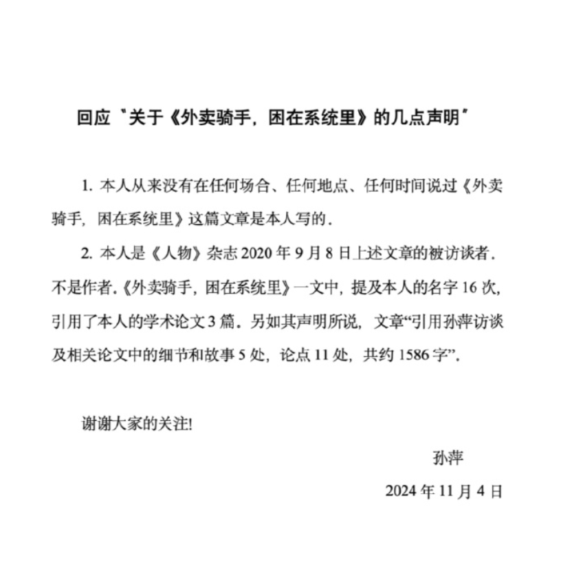 2.本人是《人物》杂志2020年9月8日上述文章的被访谈者不是作者.《外卖骑手,困在系统里》一文中,提及本人的名字16 次,引用了本人的学术论文3篇。另如其声明所说,文章“引用孙萍访谈及相关论文中的细节和故事5处,论点11处,共约1586字”。