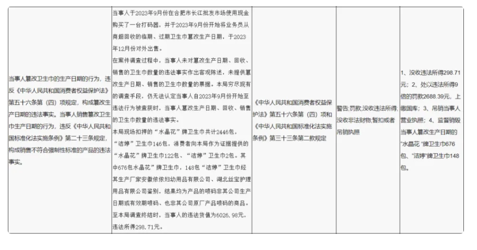 此外舒城锦鸿被吊销营业执照,监督销毁舒城锦鸿篡改生产日期的“水晶花 ”牌卫生巾676包、“洁婷”牌卫生巾148包。