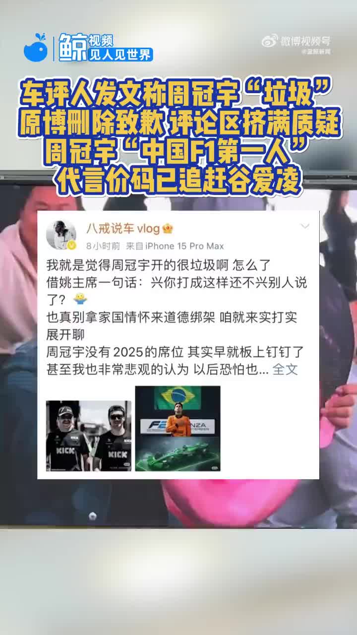 近日,汽车自媒体人“八戒说车vlog”在微博公开评论:“我就是觉得周冠宇开的很垃圾”,引发网友热议。目前,该条微博已被删除。11月5日,八戒说车vlog发文致歉,称删除原文是因为自己表达的意思被曲解,甚至妖魔化。“垃圾这个词是我不对,我诚恳道歉。但不代表我会改变观点,我也有表达观点的权利。”
