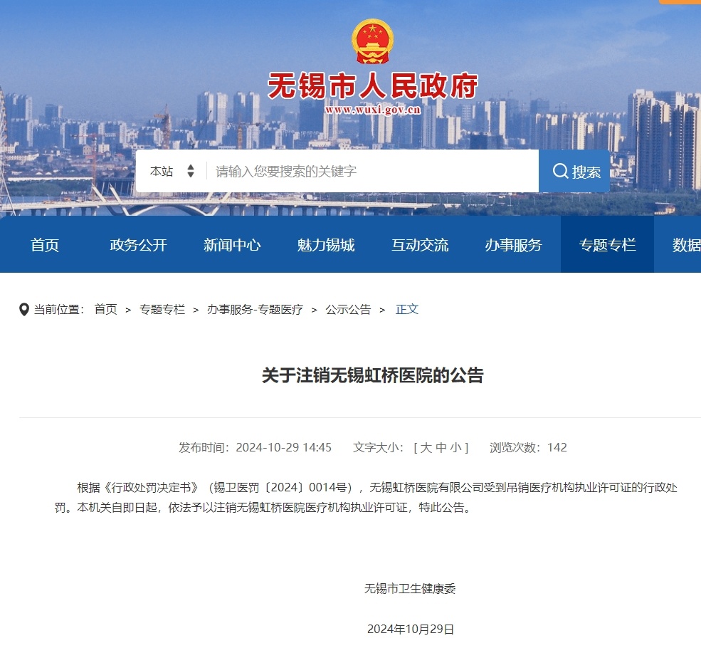 据央视新闻,无锡市人民政府网站消息,根据《行政处罚决定书》(锡卫医罚〔2024〕0014号),无锡虹桥医院有限公司受到吊销医疗机构执业许可证的行政处罚。本机关自即日起,依法予以注销无锡虹桥医院医疗机构执业许可证,特此公告。
