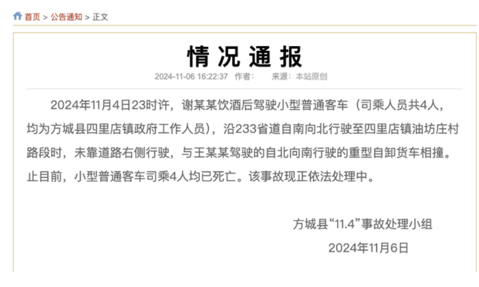 11月4日,河南南阳方城县发生一起交通事故,致4人死亡。当地发布情况通报,具体如下:11月4日23时许,谢某某饮酒后驾驶小型普通客车(司乘人员共4人,均为方城县四里店镇政府工作人员),沿233省道自南向北行驶至四里店镇油坊庄村路段时,未靠道路右侧行驶,与王某某驾驶的自北向南行驶的重型自卸货车相撞,小型普通客车司乘4人均已死亡。该事故现正依法处理中。