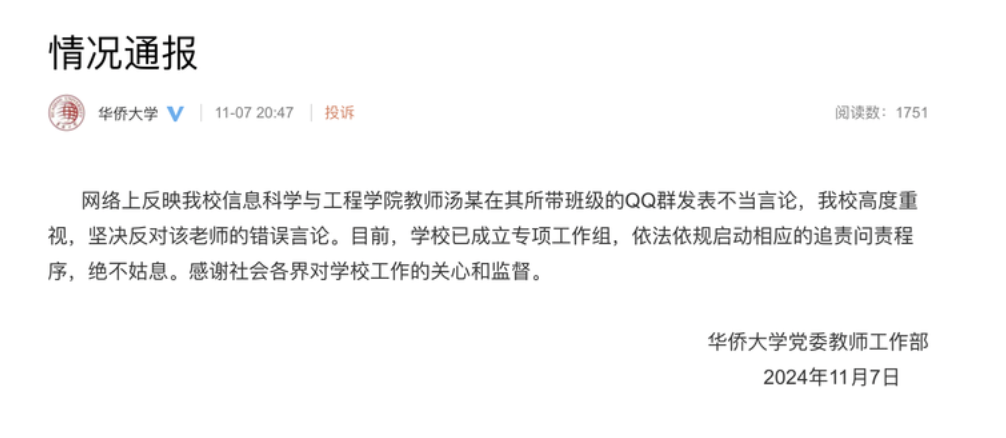当日晚,华侨大学官博发布情况通报称,网络上反映该校信息科学与工程学院教师汤某在其所带班级的QQ群发表不当言论,该校高度重视,坚决反对该老师的错误言论。目前,学校已成立专项工作组,依法依规启动相应的追责问责程序,绝不姑息。
