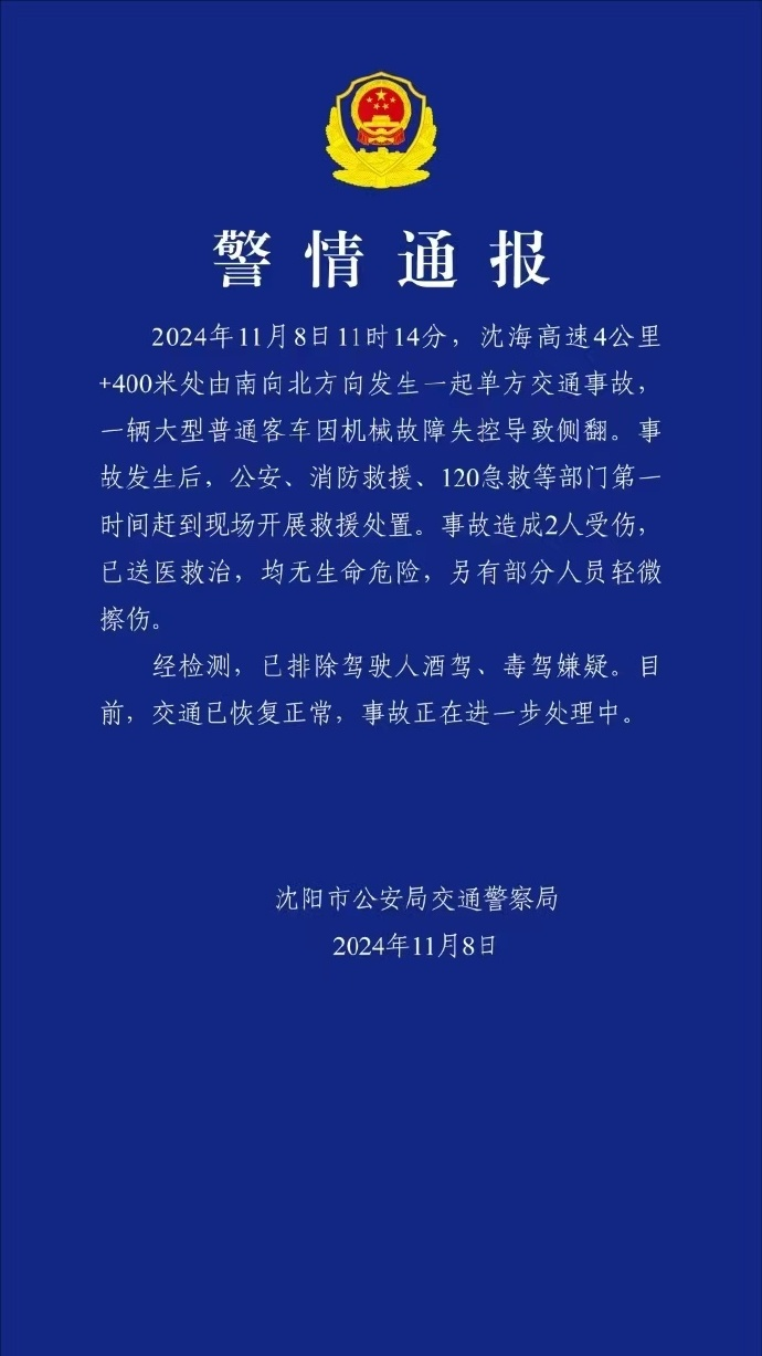 沈阳交警通报,11月8日11时14分,沈海高速发生一起单方交通事故,一辆大型普通客车因机械故障失控导致侧翻。事故发生后,公安等部门第一时间赶到现场开展救援处置。事故造成2人受伤,已送医救治,均无生命危险,另有部分人员轻微擦伤。