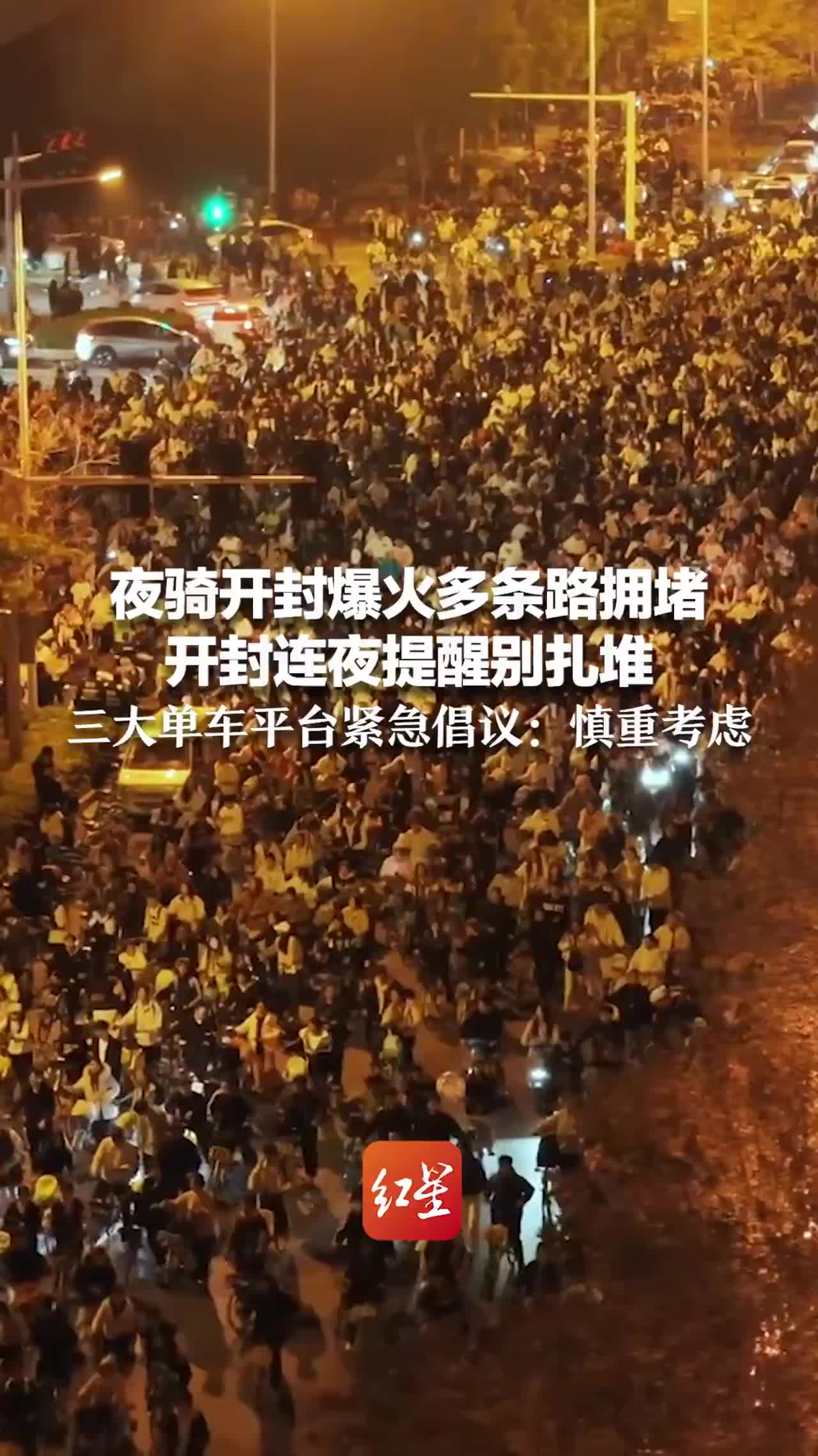 夜骑开封爆火致郑州道路拥堵,三大单车平台发布倡议书:慎重考虑,减少此类行为。