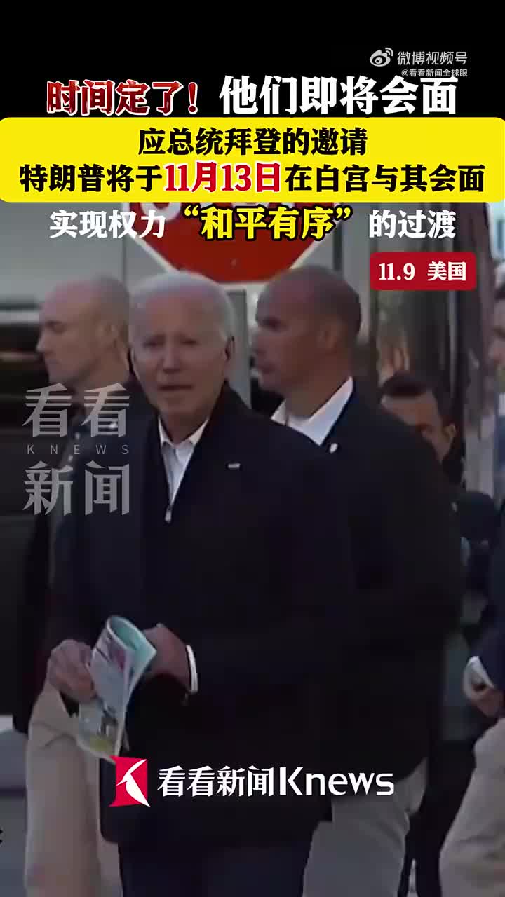 当地时间11月9日,美国白宫发表声明称,应总统拜登的邀请,赢得2024年总统选举的特朗普将于美国东部时间11月13日11时在白宫与拜登会面。目前没有公布更多其他细节。当地时间7日,拜登宣称要确保明年1月向特朗普“和平”移交权力,还呼吁美国公民接受选举结果。(via 看看新闻全球眼)