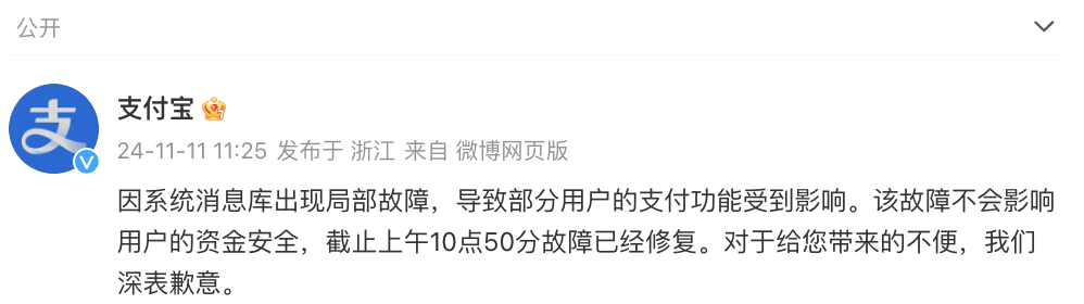 支付宝致歉:故障已修复,不会影响用户资金安全。支付宝发文称,因系统消息库出现局部故障,导致部分用户的支付功能受到影响。该故障不会影响用户的资金安全,截止上午10点50分故障已经修复。对于给您带来的不便,我们深表歉意。