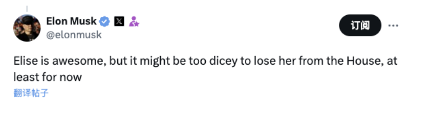 在特朗普有意邀请纽约州众议员埃莉斯·斯特凡尼克(Elise Stefanik)担任美国驻联合国大使的消息流出后,马斯克在社交平台上提出了对这项安排可能会如何影响共和党的担忧。“埃莉斯很棒,但众议院失去她可能风险太大,至少现在是这样,”马斯克写道。
