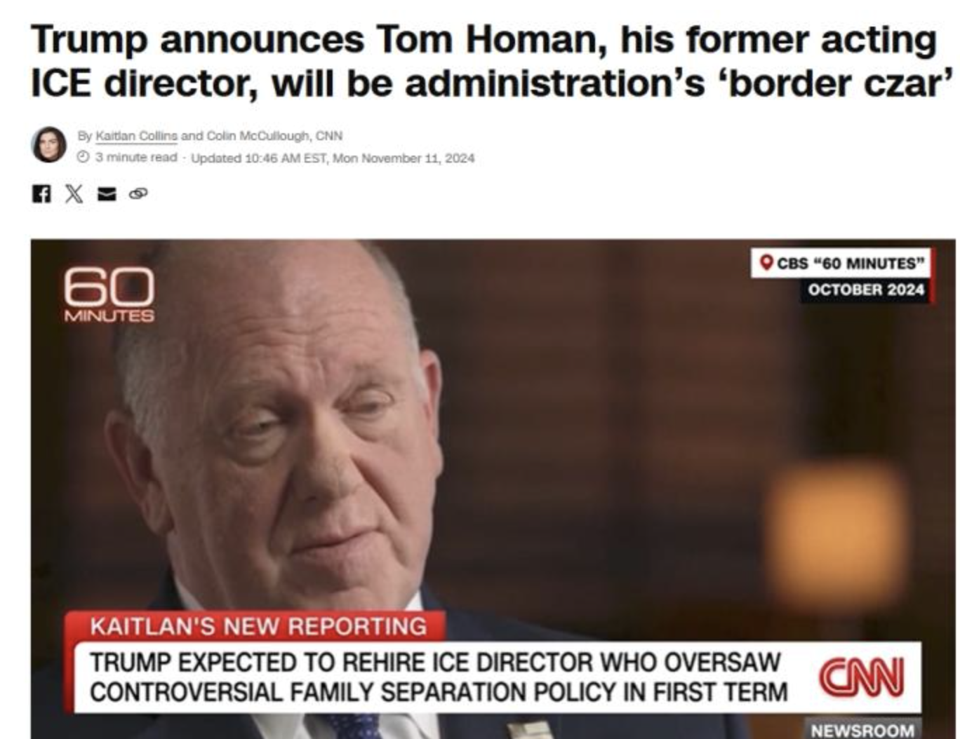 据介绍,霍曼曾在特朗普的第一个任期内担任移民与海关执法局代理局长,是颇具争议的“骨肉分离”措施的主要倡导者。在最近接受哥伦比亚广播公司(CBS)节目采访时,当被问及特朗普所承诺的大规模驱逐政策时,霍曼表示,“家人是可以一起被驱逐出境的”。他同时表示,这项工作将是有针对性的,但具体如何实施以及需要多少钱,还有待观察。