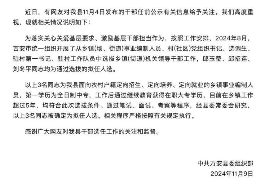 11月9日,万安县委组织部发布《情况说明》称, 3人系定向招生培养,符合选拔条件,相关程序严格按照有关规定执行。
