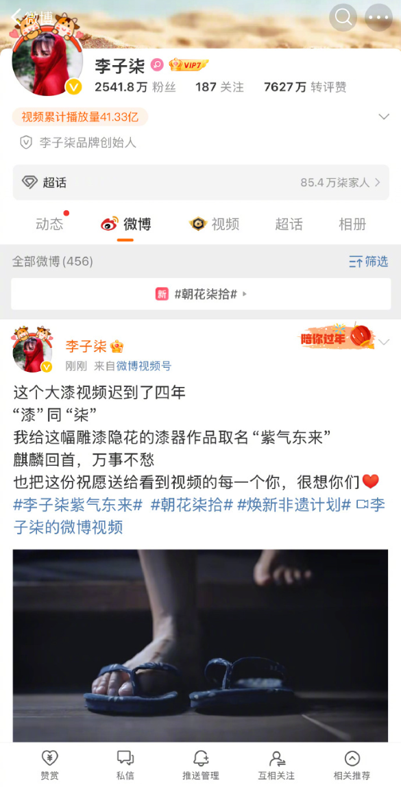 据第一财经,2024年11月12日,李子柒时隔3年在社交平台公开更新视频,表示“很想你们”。文案还提到“这个大漆视频迟到了四年”。