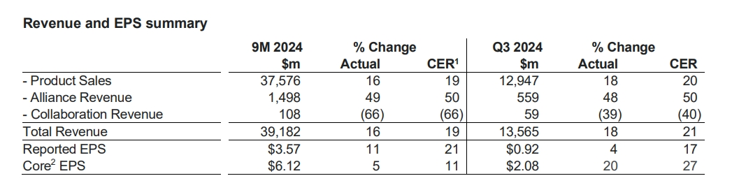 据澎湃新闻,11月12日,阿斯利康公布2024年三季报。第三季度收入135.65亿美元,同比增长(按固定汇率计算,以下同)21%,核心每股收益2.08美元,同比增长27%;前九个月整体来看,收入391.82亿美元,同比增长19%,核心每股收益6.12美元,同比增长11%。