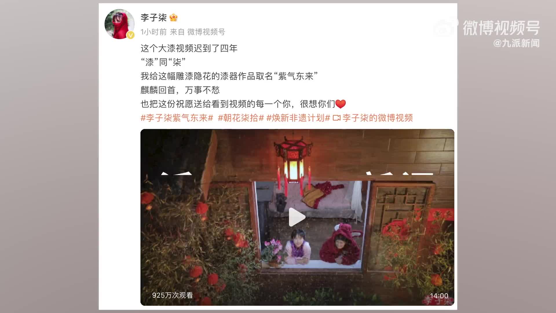 在长达1200多天的停更之后,知名传统文化短视频创作者李子柒终于于2024年11月12日正式回归,发布了一支聚焦非遗漆器的短视频,1小时内在微博播放量超过759万次。
