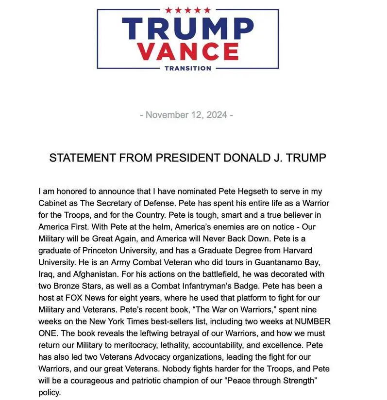 据财联社11月13日消息,根据一份电子邮件声明,当选总统唐纳德·特朗普表示,他已经提名皮特·海格塞斯(Pete Hegseth)为国防部长。