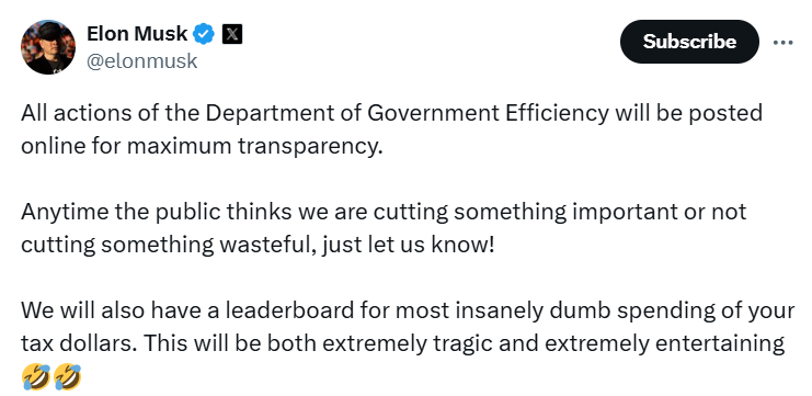 埃隆·马斯克:为了最大限度地提高透明度,政府效率部的所有行动都将发布在网上。