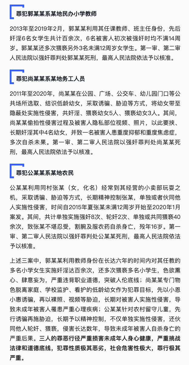 最高法:三名强奸未成年人的罪犯今天被依法执行死刑。