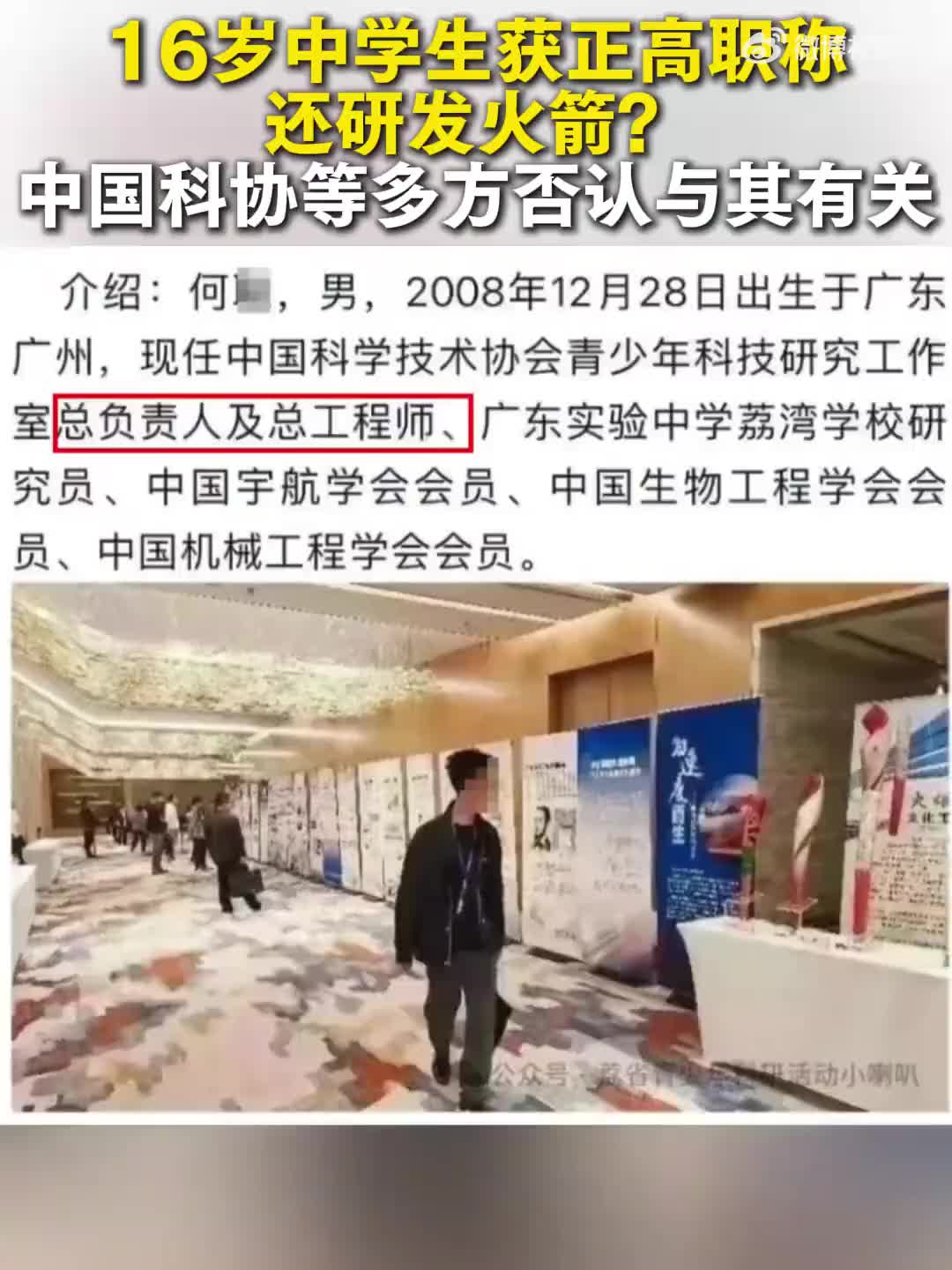 中国科协回应16岁中学生获正高职称:中国科协旗下并无此工作室,何某与中国科协无关。(via 大河报)